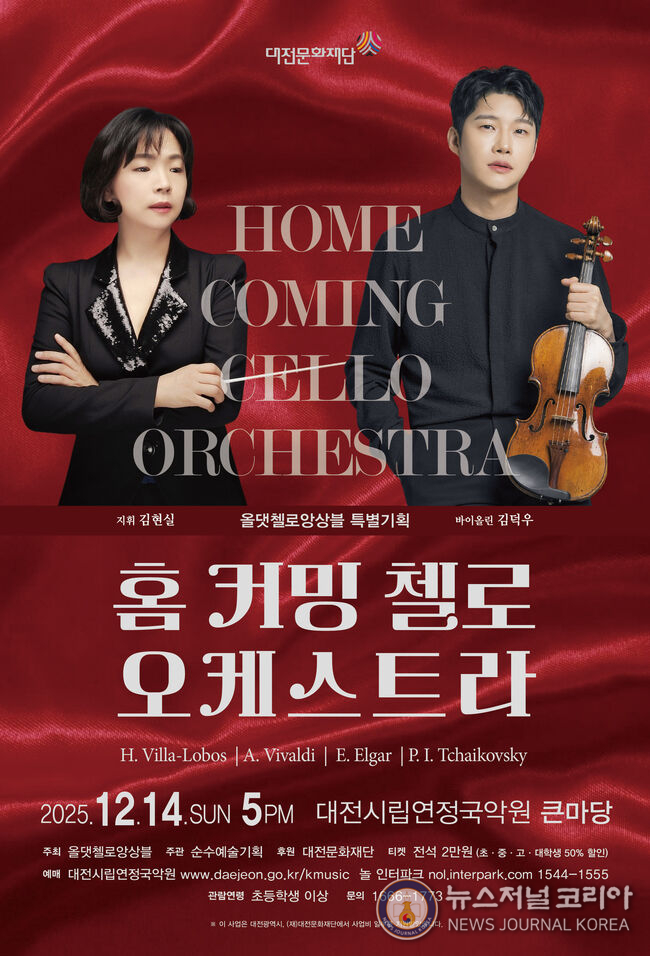 (뉴스저널코리아) 김도영 기자 = 2025 올댓첼로 특별기획 "홈 커밍 첼로 오케스트라" 오는 12월 14일 일요일 오후 5시, 대전시립연정국악원 큰마당에서 올댓첼로앙상블의 특별기획 공연 “홈 커밍 첼로 오케스트라”가 펼쳐진다. 올댓첼로앙상블이 주최하고 대전문화재단이 후원하는 이번 무대는 첼리스트이자 지휘자 김현실을 주축으로...