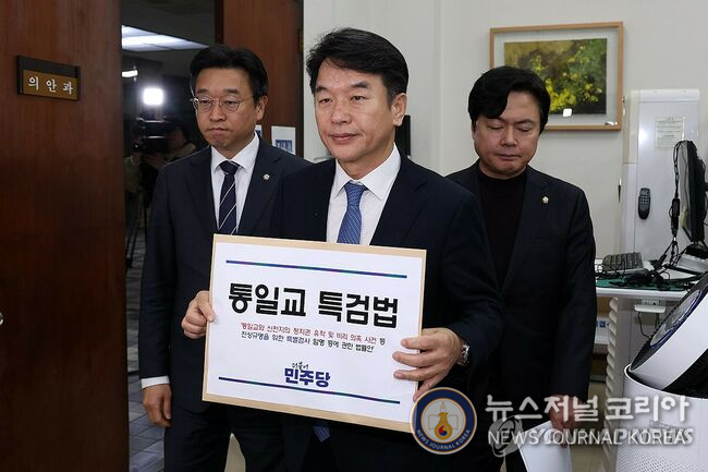 (뉴스저널코리아) 김도영 기자 = 與, '제3자 추천' 통일교 특검법 발의…'신천지'도 수사대상더불어민주당이 통일교와 신천지의 정치개입 의혹을 수사하는 특검 법안을 26일 발의했다.특별검사 추천권은 대한변호사협회 등 정치권 밖 단체들에 부여키로 했다.문진석 원내운영수석부대표, 이용우 당 법률위원장, 김현정 원내대...
