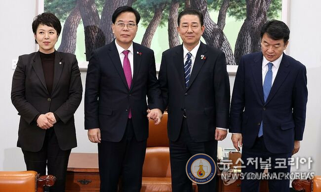 여야 원내대표 회동 (ⓒ연합뉴스=뉴스저널코리아) = 22일 국회 운영위원장실에서 더불어민주당 김병기 원내대표와 국민의힘 송언석 원내대표가 만나 악수하고 있다. 왼쪽부터 국민의힘 김은혜 원내정책수석부대표, 송 원내대표, 더불어민주당 김 원내대표, 문진석 원내운영수석부대표. 2025.12.22