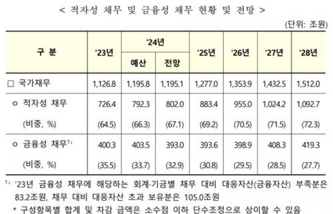 4일 기획재정부가 국회에 제출한 '2024∼2028년 국가재정운용계획'에 따르면 내년 적자성 채무는 883조4천억원으로 올해 전망치(802조원)보다 81조4천억원(10.1%) 늘어날 것으로 예상된다.