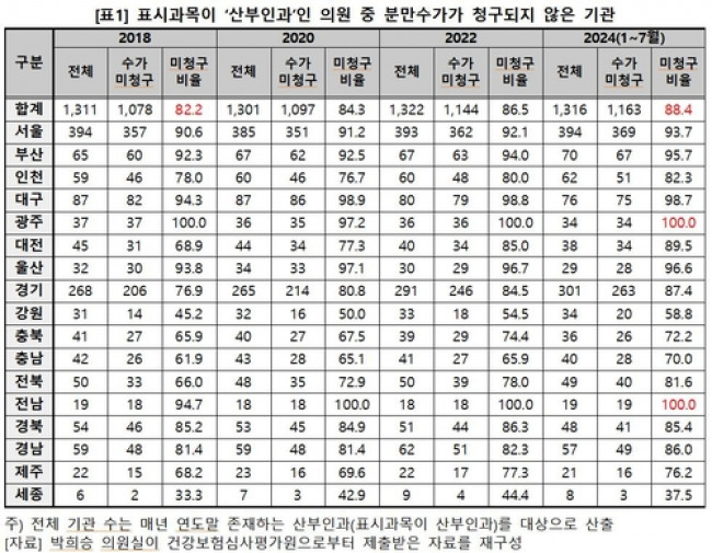 19일 국회 보건복지위원회 소속 더불어민주당 박희승 의원(남원·장수·임실·순창)이 건강보험심사평가원(심평원)에서 받은 자료에 따르면 올해 1~7월 전국 1천316개 산부인과 의원 중 심평원에 분만 수가(의료행위의 대가)를 청구하지 않은 곳은 88.4%인 1천163곳이었다.