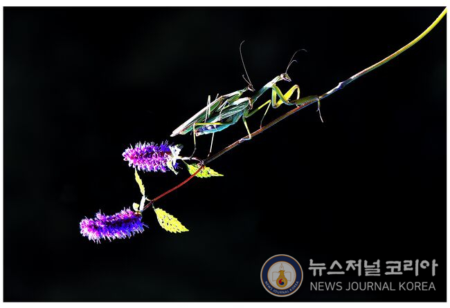 촬영=김도영 기자, 꽃향유 줄기 신방삼은 사마귀의 사랑. 사마귀는 암컷이 수컷보다 몸집이 크다. 종족번식의 마지막 사랑(?)을 나누면 암컷이 수컷을 잔인할 정도로 사냥한다. 그래서 수컷에게는 마지막 사랑일 수가 있음이다. 어미가 어부한 듯 보이는 모습이지만 목숨을 건 사랑이다.