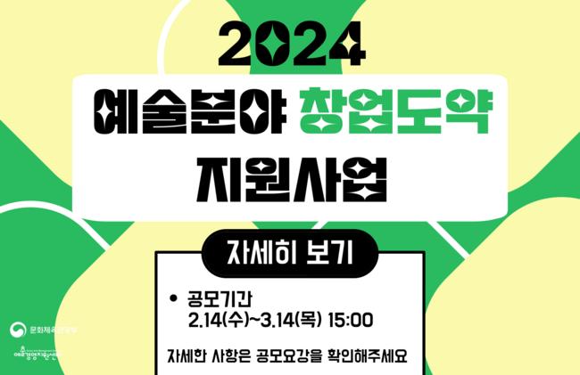 문화체육관광부(장관 유인촌, 이하 문체부)와 예술경영지원센터는 오는 3월 14일(목)까지 ‘2024 예술분야 창업기업 지원사업’에 참여할 창의적이고 지속 가능한 사업 모델을 보유한 예술 분야의 창업 기업 110개 사를 모집한다.