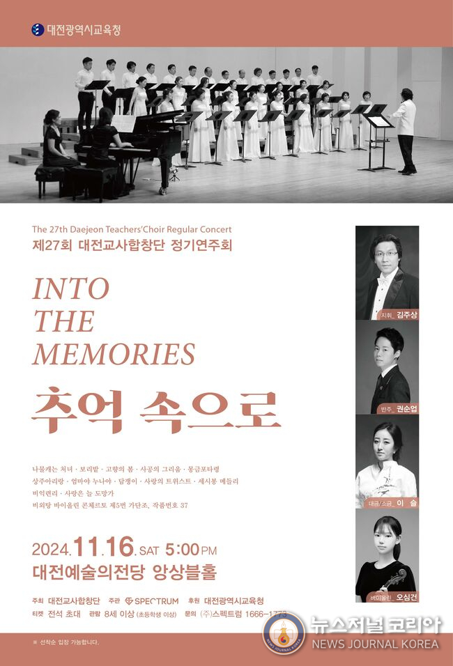 오는 11월 16일 토요일 오후 5시, 대전예술의전당 앙상블홀에서 청아하고 아름다운 화음으로 감동을 전하는 대전교사합창단이 제27회 정기연주회 "추억 속으로"를 개최한다. 대전 시민과 청소년에게 낭만적인 선율과 하모니로 감동을 선물할 예정으로, 어른과 아이, 남녀노소 누구나 즐길 수 있는 프로그램으로 잊고 있던 추억을 주제로 다채로운 합창곡을 무대에 올린다.