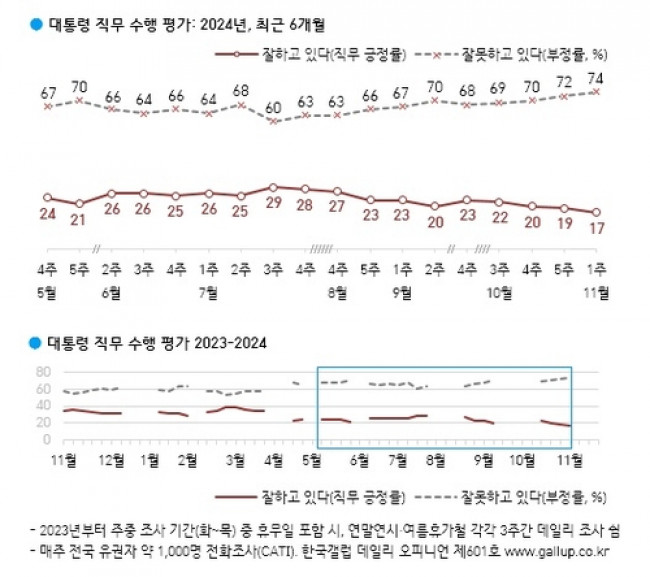 尹대통령 지지율 17%…일주일 만에 최저치 경신[한국갤럽]