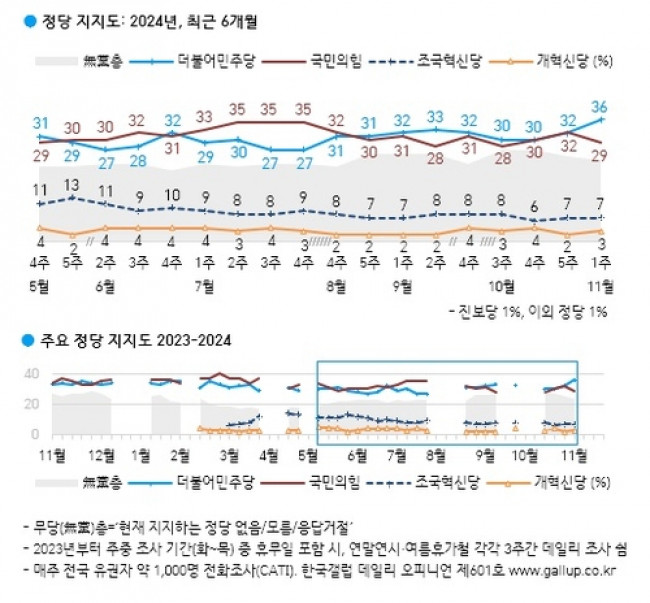 조국혁신당 7%, 개혁신당 3%, 진보당 1%로 나타났다. 지지하는 정당이 없는 무당층은 24%였다.