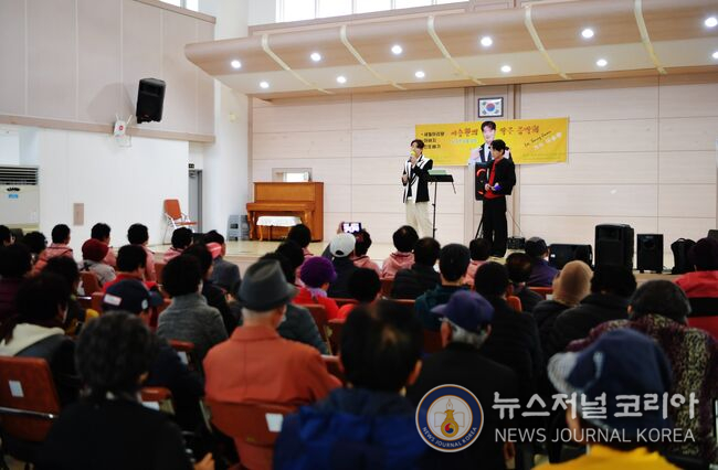 복지관 강당을 가득 매운 어르신들에게 인사를 드리는 모습(뉴스저널 코리아 자료사진,무단전재 및 DB금지)