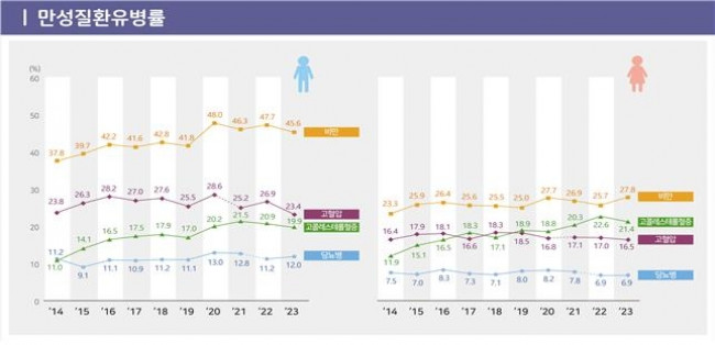 고혈압 유병률은 남자 23.4%, 여자 16.5%, 당뇨병은 남자 12.0%, 여자 6.9%로, 고콜레스테롤혈증은 남자 19.9%, 여자 21.4%로, 대체로 전년과 유사하거나 소폭 줄었다.