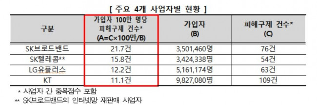 다만, 가입자 100만명당 건수로 환산하면 SK브로드밴드(가입자 수 350만명)가 21.7건으로 가장 많은 것으로 집계됐다. 이어 SK텔레콤(342만명) 15.8건, LG유플러스(516만명) 12.2건, KT(983만명) 11.1건 등 순이다.