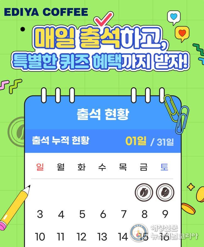 3 1()부터 3 31()까지 ‘출석 체크 이벤트’를 진행한다이디야 멤버스 앱 이벤트 페이지를 통해 1 1회 출석 체크할 수 있으며출석 누적 횟수 10, 20, 30회를 달성할 때마다 아메리카노 500, 1천원, 2천원 할인 쿠폰이 각각 제공된다.