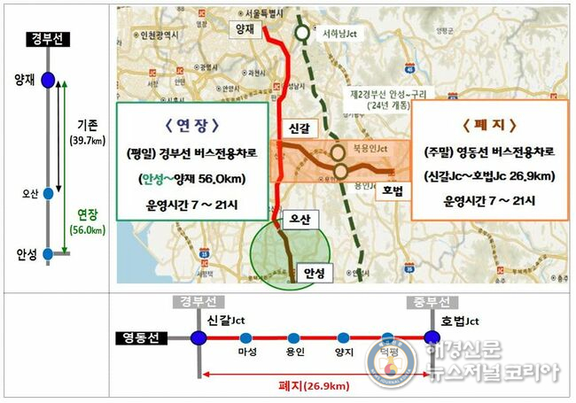 경찰청(청장 윤희근)은 “고속도로 버스전용차로 구간을 평일 경부선은 안성나들목(총 56.0km)까지 연장하고, 주말 영동선은 폐지한다.”라고 밝혔다.