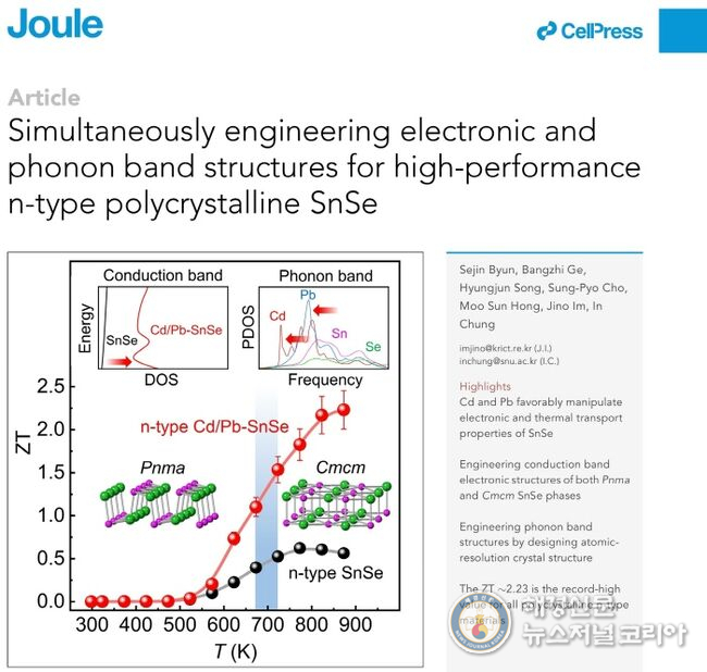 서울대 화학생물공학부 정인 교수팀, 세계 최고 성능 n형 열전 신소재 개발