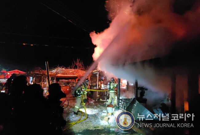 28일 오후 7시 15분께 강원 홍천군 북방면 화동리 인근 주택에서 불이 나 1시간 10분여 만에 진화됐다. 불이 나자 설을 쇠려고 고향 집에 모인 일가족 11명이 긴급 대피해 인명피해는 없었다. 경찰과 소방 당국은 고기를 굽기 위해 피운 숯불이 주변 가연물에 옮아 붙으면서 불이 번진 것으로 보고 목격자 등을 상대로 정확한 경위를 조사 중이다. 사진은 소방대원이 화재 현장에서 진화 작업을 벌이는 모습. 2025.1.28 [홍천소방서 제공. 재판매 및 DB 금지]