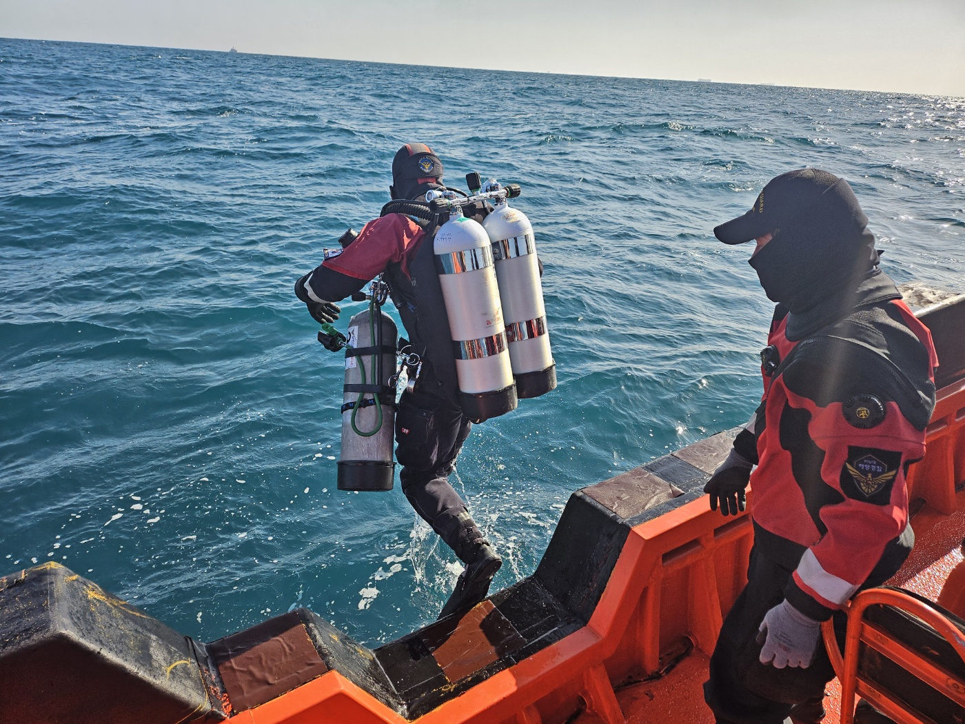 이어, 오전 9시 8분께 해경 중특단 수중 수색대원 2명이 바다로 들어가 수중수색을 30m까지 진행하였으나, 실종자, 그물, 부유물 등을 발견치 못했으며, 수중 시야는 1 ~ 1.5m 정도 보이는 상태였다.