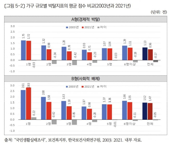 즉, 18년간 전체 가구의 경제적 박탈이 크게 감소한 데 반해 사회적 배제는 소폭 감소했으며, 1인 가구의 경우 사회적 배제는 오히려 증가한 것이다.