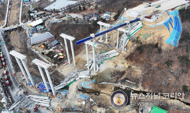 25일 오전 9시 49분께 경기도 안성시 서운면 산평리 소재 서울세종고속도로 안산∼용인 구간 연결공사의 교량 건설 현장에서 교각에 올려놓았던 상판 4∼5개가 떨어져 내렸다.