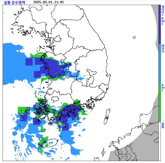 1일 오전 11시 45분 현재 강수 구역. [기상청 제공. 재판매 및 DB 금지]
