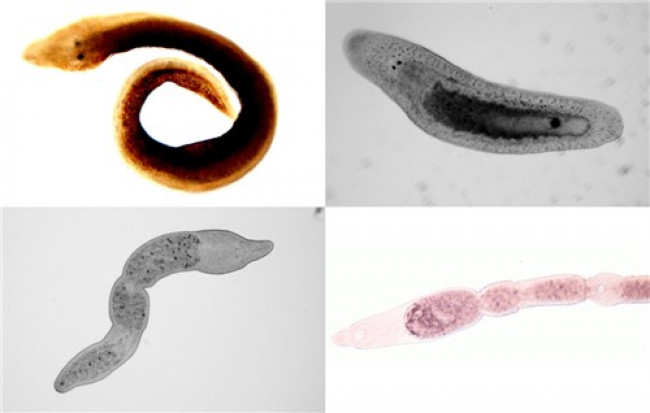 왼쪽 위부터 시계방향으로 작은플라나리아, 큰입납작벌레, 뾰족머리좁은입납작벌레, 두사슬좁은입납작벌레. [국립생물자원관 제공. 재판매 및 DB 금지]