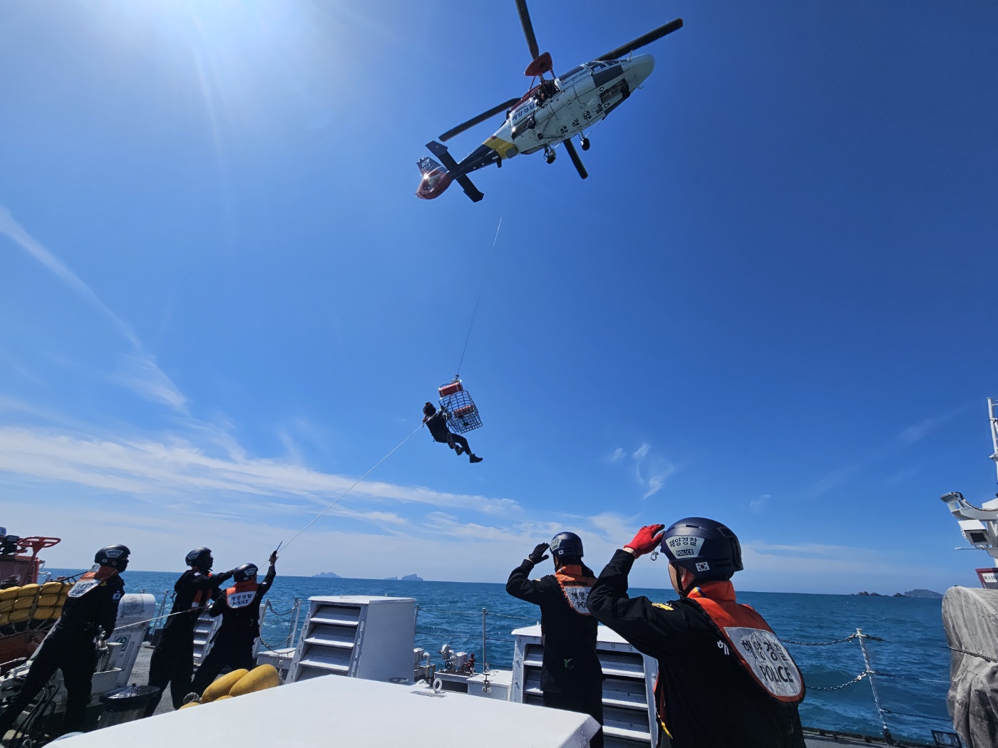 여수해경에 따르면 25일 오전 10시 30분께 여수시 삼산면 백도 인근 해상에서 중형 경비함정(516함)과 서해해경청 소속 여수항공단 헬기를 이용해 경비함정 갑판의 응급환자를 헬기 호이스트를 이용해 직접 인양하는 훈련에 나섰다.