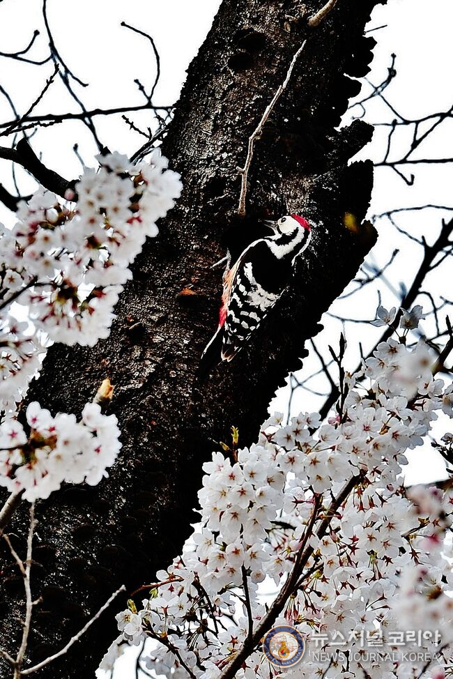 산중의 벚나무를 쪼는 오색딱따구리(사진=뉴스저널코리아) 김도영) 무단전재 및 DB금지.
