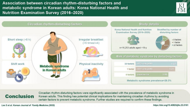 아침 결식, 수면 부족, 신체활동 부족, 교대 근무 등 일주기 리듬 교란 요인을 1개 보유한 경우 전혀 없는 환자와 비교해 대사증후군 발병 위험이 21% 높았다. 2개 이상이면 그 위험이 27% 증가했다.