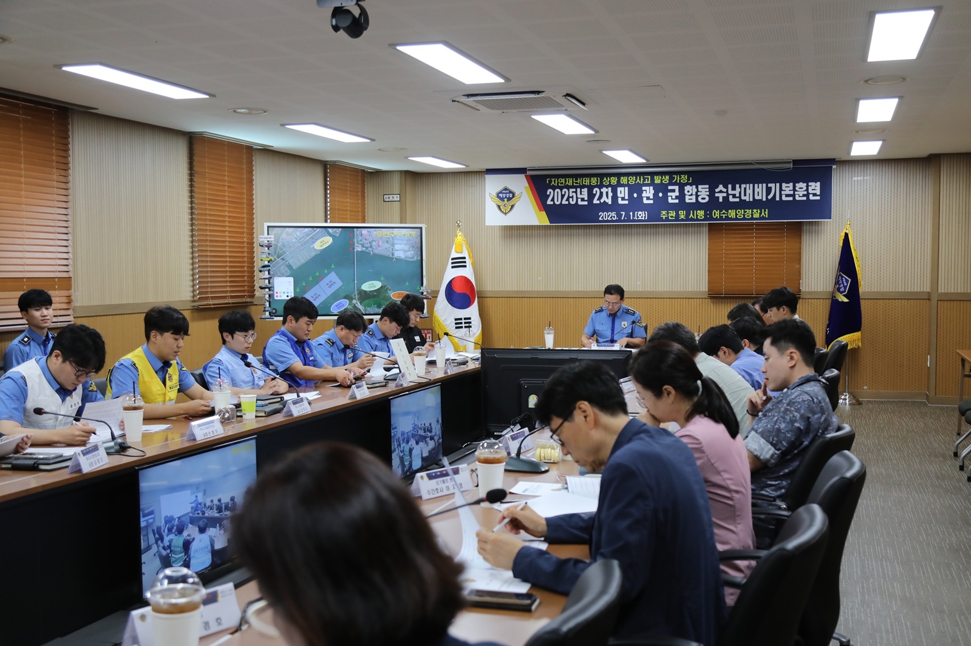 여수해양경찰서(서장 김기용)는 오늘(1일) 여수해경 대회의실에서 태풍 내습 중 해양사고에 대비한 ‘2025년 제2차 민·관·군 합동 수난대비기본훈련(TTX)을 실시했다고 밝혔다.