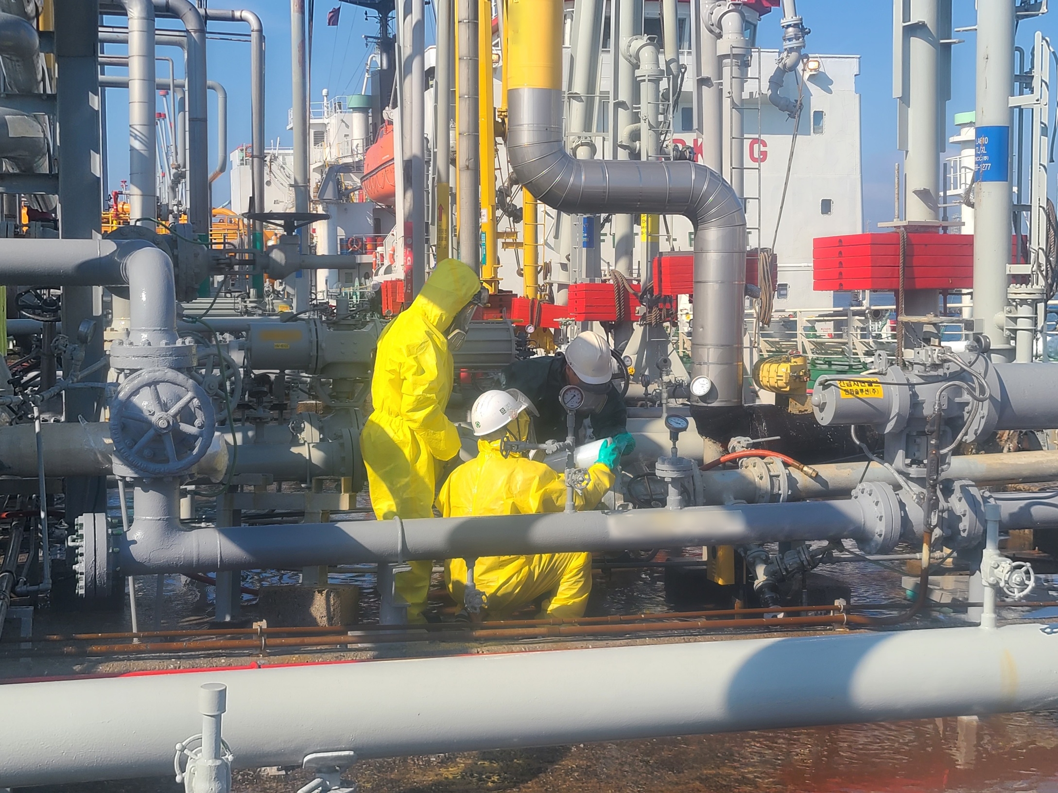 신고를 접수한 여수해경은 즉시 방제정과 경비함정을 현장에 급파하였으며, 드론을 이용하여 파손된 배관 및 해상을 열화상카메라 촬영을 통해 사고현장 주변 안전상태를 파악하였고, 가스탐지기와 소화포를 이용하여 증기억제 및 중화작업을 실시하였다.