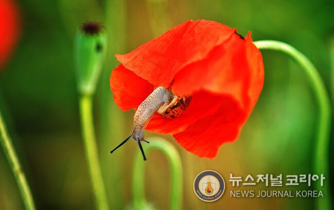 양귀비를 찾은 달팽이(사진=뉴스저널코리아 김도영 기자)무단전재 및 DB금지.