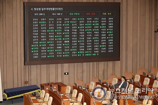 국회는 이날 오후 방송법 개정안을 재석 180명 중 찬성 178명, 반대 2명으로 가결했다. 국민의힘은 표결에 반발해 퇴장했다.