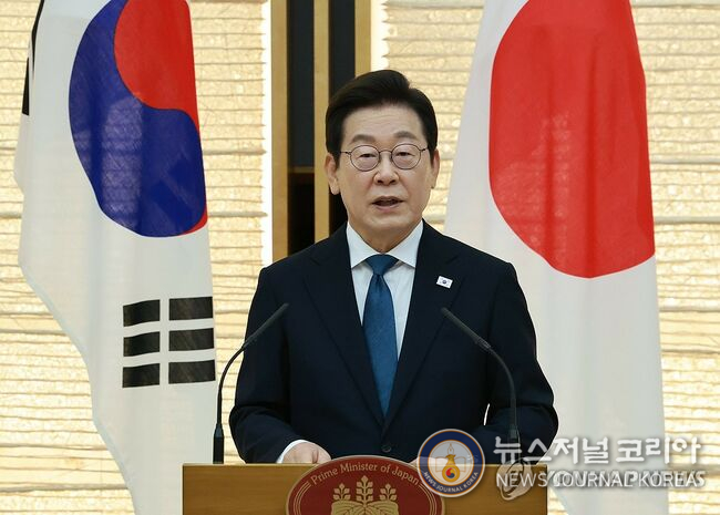 (도쿄=ⓒ연합뉴스=뉴스저널코리아) = 이재명 대통령이 23일 일본 도쿄 총리 관저에서 열린 한일 정상 공동 언론 발표에서 발언하고 있다. 2025.8.23