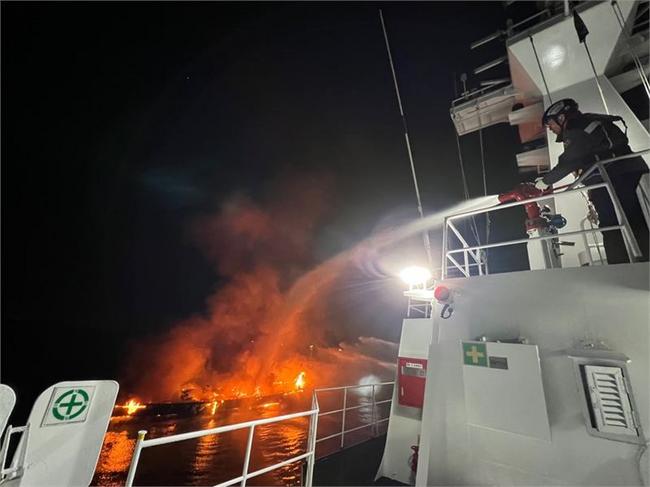 어선 화재에 경비함정이 소화포로 불길을 잡고 있다.