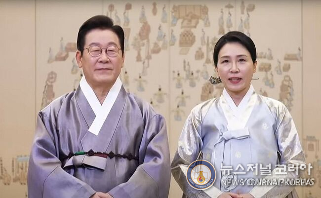 추석 영상 메시지 전하는 이재명 대통령과 김혜경 여사 (ⓒ연합뉴스=뉴스저널코리아) 이재명 대통령과 김혜경 여사가 추석 연휴 이틀째인 지난 4일 한복 차림으로 영상 메시지를 통해 명절 인사를 전하고 있다.