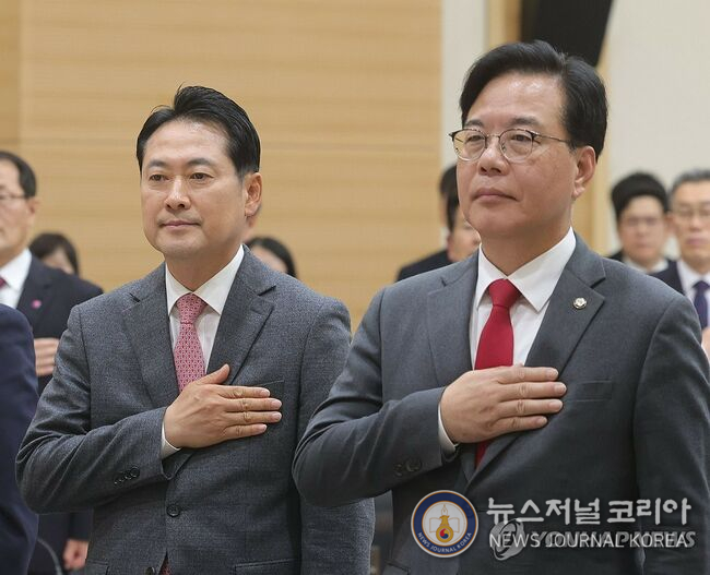 국민의례하는 장동혁 대표 (ⓒ연합뉴스=뉴스저널코리아) = 4일 경남 창원시 경남도청에서 열린 국민의힘-부산·울산·경남 지역민생 예산정책협의회에서 국민의힘 장동혁 대표(왼쪽)와 송언석 원내대표 등이 국민의례를 하고 있다. 2025.11.4