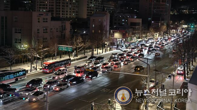 올겨울 많은 양의 첫눈이 내린 4일 23시께 서울 종로구 경복궁역 인근에서 시내로 향하는 차량이 눈길에 정체를 빚고 있다. 2025.12.4