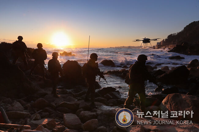 (뉴스저널코리아) 김도영 기자 = 드론과 함께 해안 경계 작전 수행하는 육군 제23경비여단