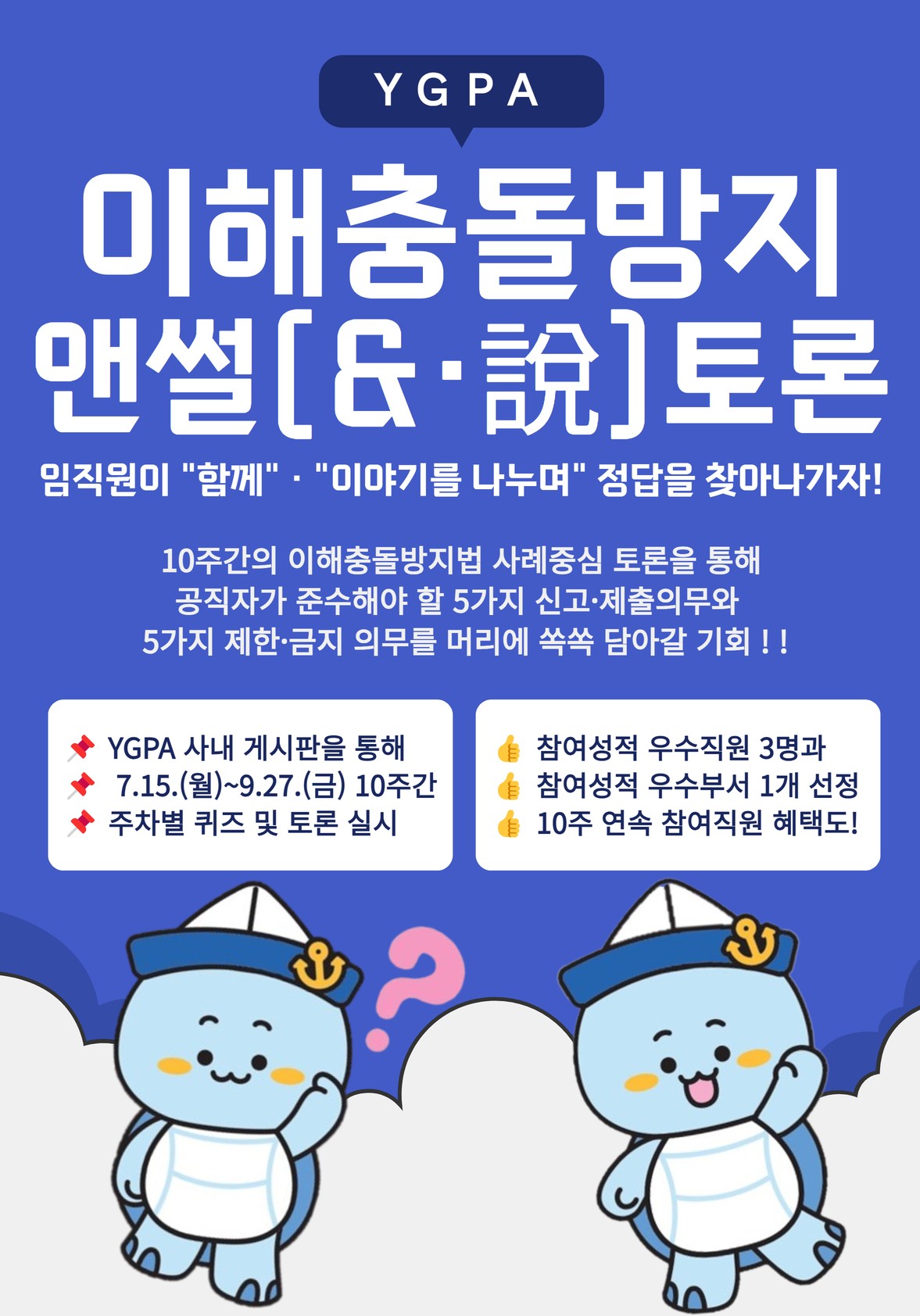 이번 교육 프로그램의 명칭은 "YGPA 이해충돌방지 앤썰(&·說) 토론방"으로, 이해충돌방지법에 명시된 5가지 신고·제출의무와 5가지 금지·제한의무를 중심으로 실제 사례를 활용해 온라인 토론을 하는 방식이다.