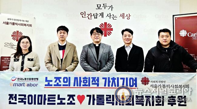 (뉴스저널코리아) 김도영 기자 = 연말을 맞아 이마트 교섭대표노조 전국이마트노동조합(위원장 김상기)은 지난 12월 4일 조합원들의 소중한 정성을 모아 서울가톨릭사회복지회를 찾아 후원했다. 1976년 설립된 서울가톨릭사회복지회 부회장 김원호 바오로 신부로부터 설립자 故 김수환 추기경님의 ‘모두가 인간답게 사는 세상'의 뜻을...