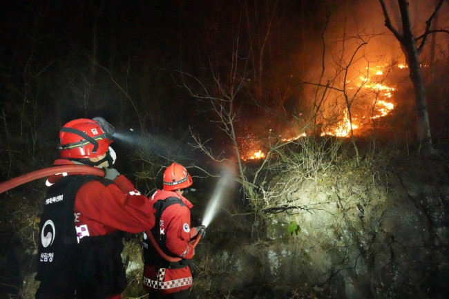 야간산불 진화하는 산불재난특수진화대야간산불 진화하는 산불재난특수진화대 [산림청 제공. 재판매 및 DB 금지]