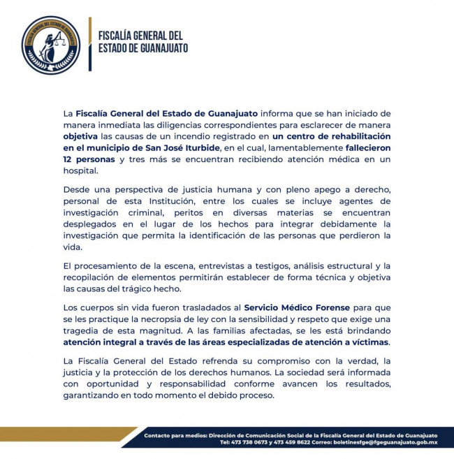 멕시코 과나후아토주(州) 검찰청은 이날 배포한 에서 "산호세이투르비데 소재 마약 재활센터 건물 별관 화재로 12명이 숨지고 3명이 다쳤다"며 "증거물 수집, 목격자 진술 확보, 건물 구조 분석 등을 통해 객관적으로 화재 원인을 규명할 예정"이라고 설명했다.