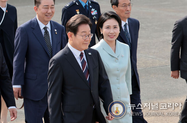 이재명 대통령, '첫 순방' G7 정상회의 참석 출국 (연합뉴스=뉴스저널코리아) = 주요 7개국(G7) 정상회의에 참석하는 이재명 대통령이 김혜경 여사와 16일 성남 서울공항 공군 1호기에서 출국하기 전 인사하고 있다.