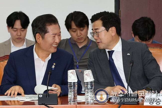더불어민주당 당대표 후보인 정청래·박찬대 의원이 2일 서울 여의도 국회에서 열린 검찰개혁토론회에 나란히 참석해 대화하고 있다. 2025.7.2(자료사진 ⓒ연합뉴스=뉴스저널코리아)