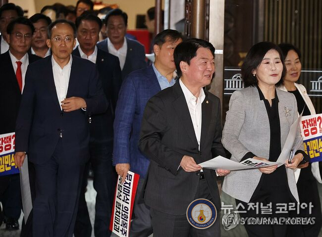 국민의힘 혁신위원장으로 내정된 안철수 의원(오른쪽 세번째)이 본회의가 열리고 있는 지난 3일 서울 여의도 국회 로텐더홀에서 김민석 국무총리 후보자 임명동의안 등을 규탄하기 위해 동료 의원들과 이동하고 있다. 2025.7.3 (연합뉴스ⓒ 뉴스저널코리아)