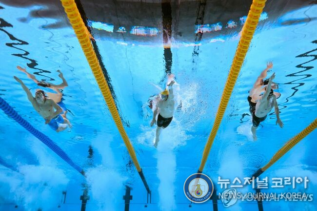 결승에서 3번 출발대에 선 김우민은 첫 50m 구간을 메르텐스에 이어 2위로 돌았다.