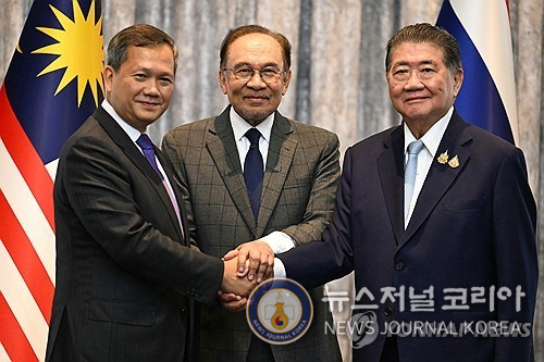 태국-캄보디아 전격 휴전 합의 28일(현지시간) 말레이시아 행정수도 푸트라자야에서 훈 마네트 캄보디아 총리(사진 왼쪽)와 태국 총리 권한대행인 품탐 웨차야차이 부총리 겸 내무부 장관(오른쪽)이 휴전에 합의한 뒤 회담을 중재한 안와르 이브라힘 말레이시아 총리(가운데)와 함께 손을 잡고 있다. [AP 연합뉴스,뉴스저널코리아. 재판매 및 DB 금지]