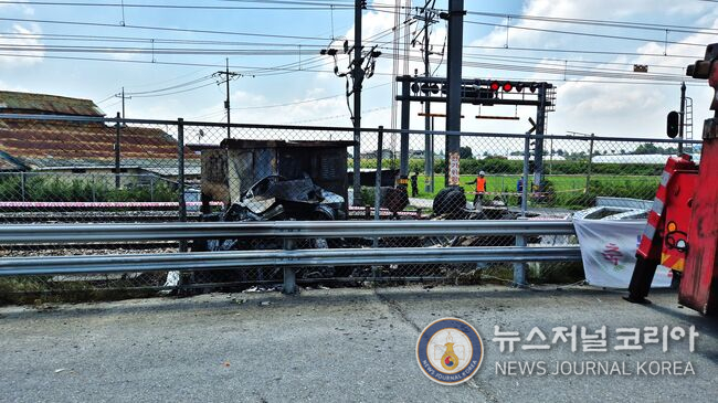 1402열차와 충돌해 처참하게 부서지고 불탄 화물탑차(사진=뉴스저널 오관영 기자)무단전재 및 DB금지)