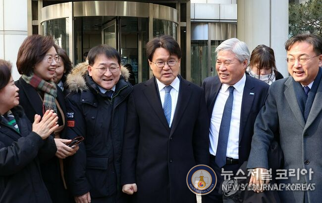 (ⓒ연합뉴스=뉴스저널코리아) = 4일 서울 서초구 서울고등법원에서 열린 문재인 정부 청와대의 '울산시장 선거 개입 의혹' 사건 2심 선고공판에서 무죄가 선고된 조국혁신당 황운하 원내대표가 법정을 나서며 동료 의원들로부터 축하를 받고있다. 2025.2.4