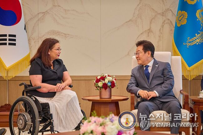 이재명 대통령, 태미 덕워스 등 미국 상원의원 접견 (ⓒ연합뉴스=뉴스저널코리아) 이재명 대통령이 18일 서울 용산 대통령실 청사에서 태미 덕워스 미국 상원의원을 만나 대화하고 있다. 2025.8.18 [대통령실 제공. 재판매 및 DB 금지]