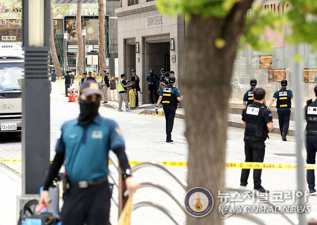 8월 5일 서울 중구 명동 신세계백화점 본점에 폭발물을 설치했다는 협박글이 올라와 경찰이 주변을 통제하는 모습 [연합뉴스=뉴스저널코리아]
