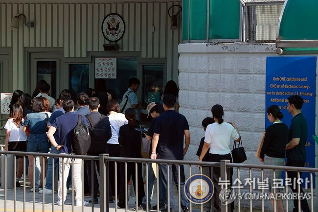미국 비자 발급 위해 미대사관 찾은 시민들 [ⓒ연합뉴스=뉴스저널코리아 자료사진 재판매 및 DB금지] 15일 서울 종로구 주한미국대사관에서 미국 비자를 발급받으려는 시민들이 줄을 서고 있다.