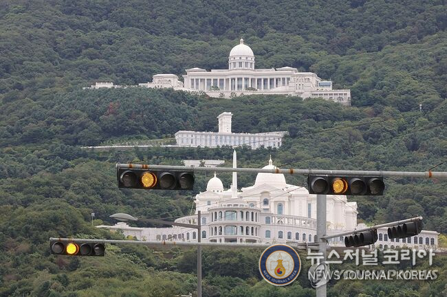 가평 통일교 본부 (ⓒ연합뉴스=늇저널코리아) = 한학자 통일교 총재에 대한 민중기 특별검사팀 조사가 종료된 가운데 18일 오전 경기도 가평군 통일교 본부 일대가 적막하다. 2025.9.18